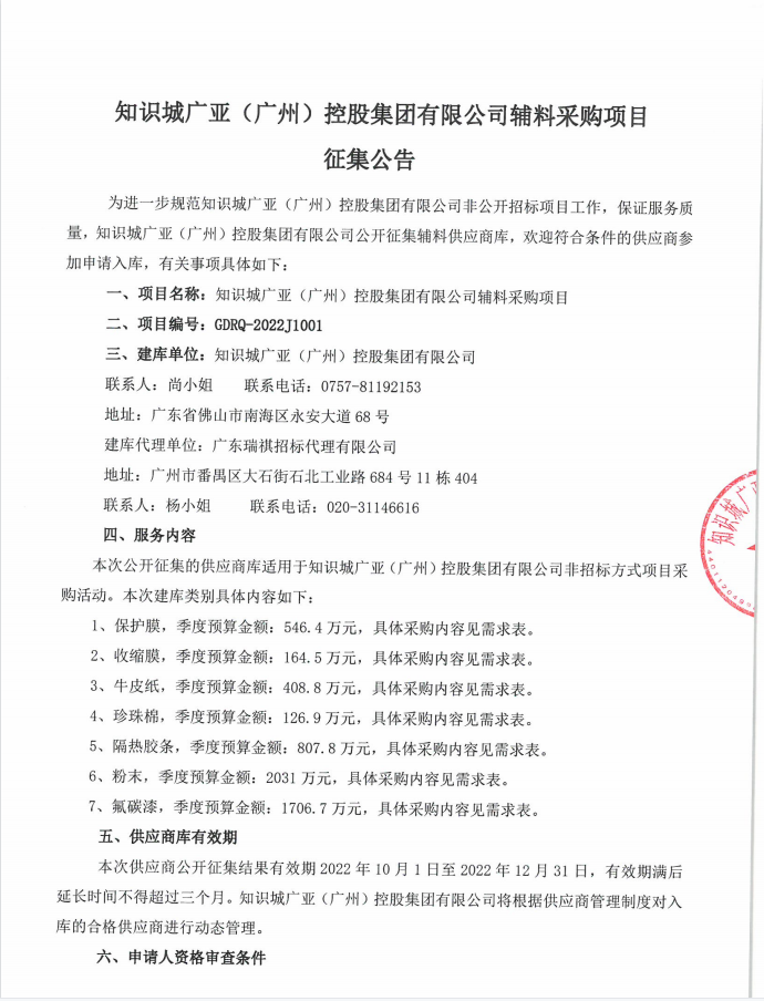 知识城amjs澳金沙门(广州)控股集团有限公司辅料采购项目征集公告 字体大小: 小 中 大 更新日期:2022-10-28 | 返回 上一篇:光伏组装线项目场地硬化工程项目更正公告 下一篇:山东骏富棒炉采购-招标公告